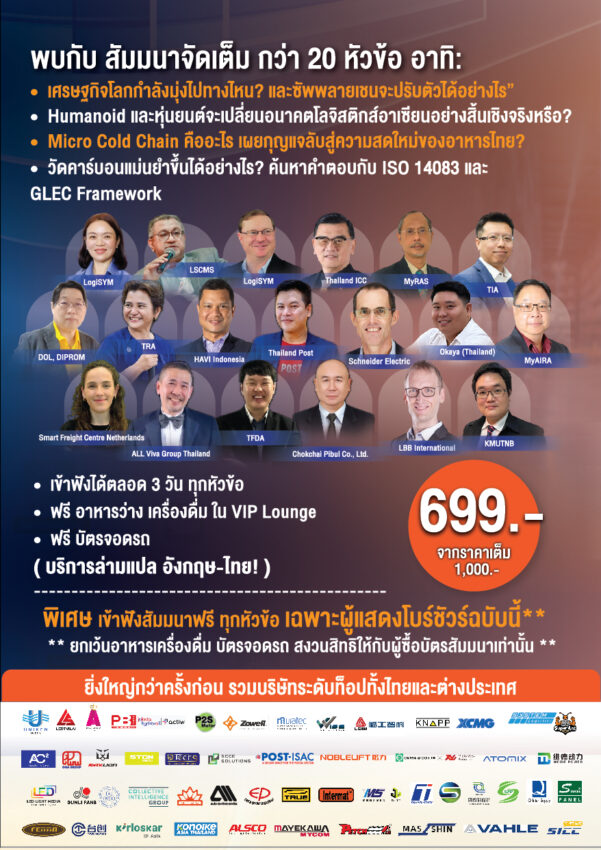 • Highlight Topics อาทิ “เศรษฐกิจโลกกำลังมุ่งไปทางไหน? และซัพพลายเชนจะปรับตัวได้อย่างไร”, “Humanoid และหุ่นยนต์จะเปลี่ยนอนาคตโลจิสติกส์อาเซียนจริงหรือ?”, “Micro Cold Chain กุญแจลับสู่ความสดใหม่ของอาหารไทย” และ “วัดคาร์บอนแม่นยำขึ้นได้อย่างไร? ด้วย ISO 14083 และ GLEC Framework”