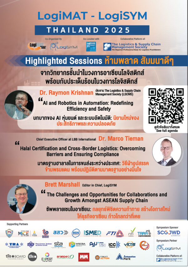 • Highlight Sessions จากวิทยากรชั้นนำ อาทิ Dr. Raymon Krishnan, President, Logistics & Supply Chain Management Society (Southeast Asia Market) ในหัวข้อ “บทบาทของ AI หุ่นยนต์ และระบบอัตโนมัติ: นิยามใหม่ของประสิทธิภาพและความปลอดภัย”, Dr. Marco Tieman CEO จาก LBB International หัวข้อ “มาตรฐานฮาลาลในการขนส่งระหว่างประเทศ: วิธีฝ่าอุปสรรคข้ามพรมแดน พร้อมปฏิบัติตามมาตรฐานอย่างมั่นใจ” และ Brett Marshall บรรณาธิการ LogiSYM ในหัวข้อ “ซัพพลายเชนในอาเซียน: กลยุทธ์พิชิตความท้าทาย สร้างโอกาสใหม่ให้ธุรกิจอาเซียนก้าวไกลกว่าที่เคย”