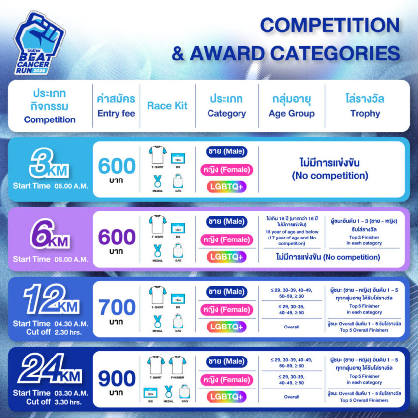 “สำหรับความพิเศษของ Brother Beat Cancer Run 2026 คือการเพิ่มระยะวิ่ง 3 กิโลเมตรเข้ามาเป็นทางเลือกใหม่ เพื่อตอบสนองเสียงเรียกร้องของคนที่อยากเริ่มดูแลสุขภาพ ให้ตัดสินใจออกมาออกกำลังกายได้ง่ายขึ้น เมื่อผสานกับระยะทางวิ่งเดิมที่ประกอบไปด้วย 6 กิโลเมตร 12 กิโลเมตร และ 24 กิโลเมตร เชื่อมั่นว่าการจัดงานครั้งนี้จะสามารถรวบรวมนักวิ่งเป็นไปตามเป้าที่ตั้งไว้ 2,300 คน อย่างไรก็ตาม สำหรับผู้ที่ไม่สะดวกร่วมกิจกรรมวิ่ง แต่มีใจรักและต้องการร่วมเป็นส่วนหนึ่งของการส่งต่อพลังแห่งการให้ ยังสามารถร่วมบริจาคเงินสมทบทุนเพื่อสนับสนุนภารกิจของงานได้เช่นกัน ทั้งหมดนี้แสดงให้เห็นถึงพลังการส่งเสริมให้คนทุกวัยหันมาดูแลสุขภาพเชิงป้องกัน พร้อมไปกับการส่งต่อกำลังใจที่ยิ่งใหญ่ให้แก่ผู้ป่วยที่กำลังรอคอยความช่วยเหลือ”