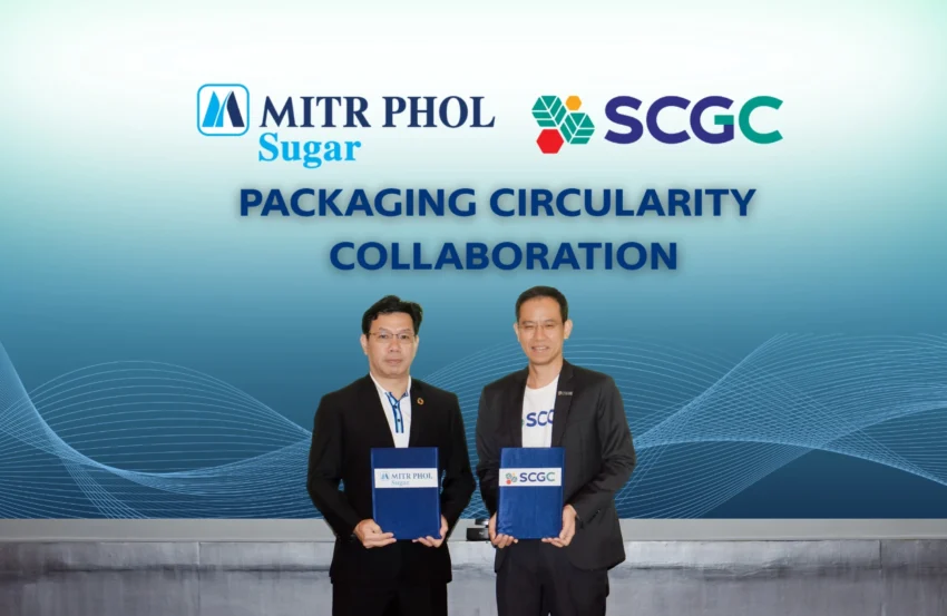 ผรินทร์ อมาตยกุล รองกรรมการผู้จัดการใหญ่ กลุ่มงานการตลาด บริษัท น้ำตาลมิตรผล จำกัด ผู้นำการผลิตน้ำตาลในภูมิภาคเอเชียแปซิฟิก และ ชาตรี เอี่ยมโสภณา ประธานเจ้าหน้าที่สายงานพาณิชย์ บริษัท เอสซีจี เคมิคอลส์ จำกัด (มหาชน) หรือ SCGC ผู้นำธุรกิจพอลิเมอร์และโซลูชันครบวงจรเพื่อความยั่งยืน ร่วมลงนามบันทึกความร่วมมือ (MoU) โครงการ “ความร่วมมือบรรจุภัณฑ์หมุนเวียนเพื่อความยั่งยืน (Packaging Circularity Collaboration)” ด้วยนวัตกรรมเม็ดพลาสติกรีไซเคิลคุณภาพสูง (High Quality PCR) จาก SCGC GREEN POLYMER โดยนำพลาสติกใช้แล้วภายในโรงงานอุตสาหกรรมของน้ำตาลมิตรผล กลับมารีไซเคิลและผลิตเป็นฟิล์มสำหรับห่อผลิตภัณฑ์ต่าง ๆ ของกลุ่มมิตรผล อาทิ น้ำตาลมิตรผล เฟรชชี่ ไซรัป รวมทั้งฟิล์มหดรัดสำหรับผลิตภัณฑ์น้ำแร่เอโตะ