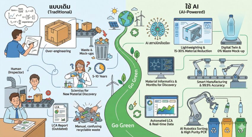 อย่างไรก็ตาม คำถามที่ตามมาคือ ถ้าไม่มี AI เราสามารถทำบรรจุภัณฑ์รักษ์โลกได้ไม่ใช่หรือ? คำตอบคือ ได้ แต่ผลลัพธ์และความเร็วจะแตกต่างกันอย่างมหาศาล คอลัมน์ Go Green ฉบับนี้ จะพาผู้อ่านไปเจาะลึกการเปรียบเทียบระหว่างวิธีการแบบเดิมกับขุมพลัง AI เพื่อให้เห็นว่าทำไม AI จึงเป็นกุญแจสำคัญของสมาคมการบรรจุภัณฑ์ไทยในการก้าวสู่ระดับสากล